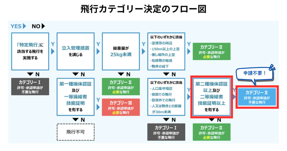 現在、私たちが仕事や趣味で使う機体の多くが目指しているのは「第二種」です。立ち入り管理措置を講じたうえで行う特定飛行(カテゴリーⅡ)を目的としています。