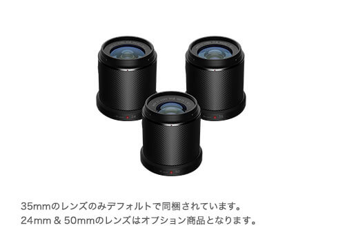 3軸ジンバルスタビライザー上のレンズは交換可能で、焦点距離:24/35/50mmのレンズを状況に応じて使い分けることができます。※35mmのレンズのみデフォルトで同梱されています。24mm&50mmのレンズはオプション商品となります。